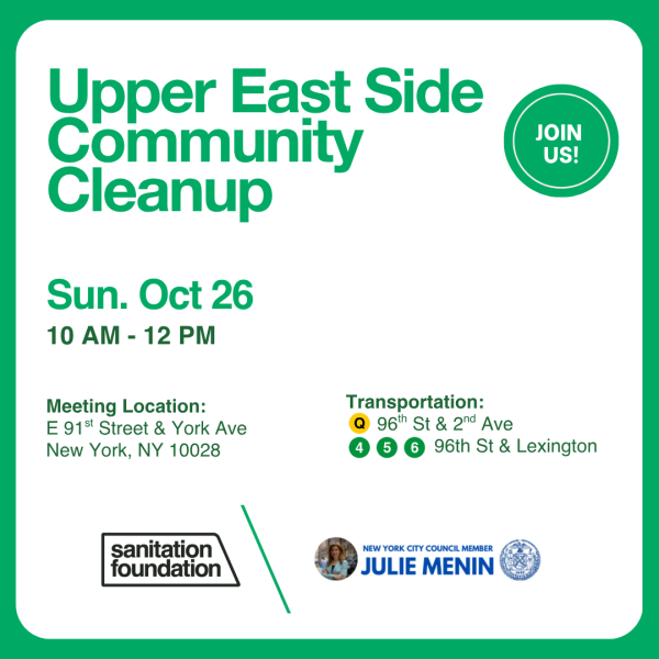 The Sanitation Foundation is teaming up with Council Member Julie Menin to host a family-friendly community cleanup on the Upper East Side. It’s a great opportunity to get to know your neighbors and help keep NYC clean!