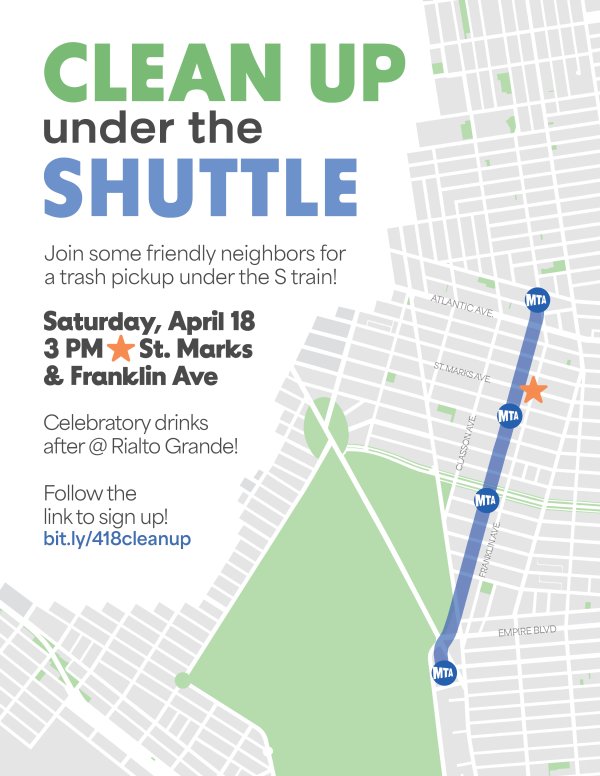 We focus on advocating for the spaces next to and beneath the Franklin Avenue Shuttle, so we're meeting at the southwest corner of St. Marks Avenue and Franklin Avenue to start the clean-up along St. Marks and underneath the shuttle.